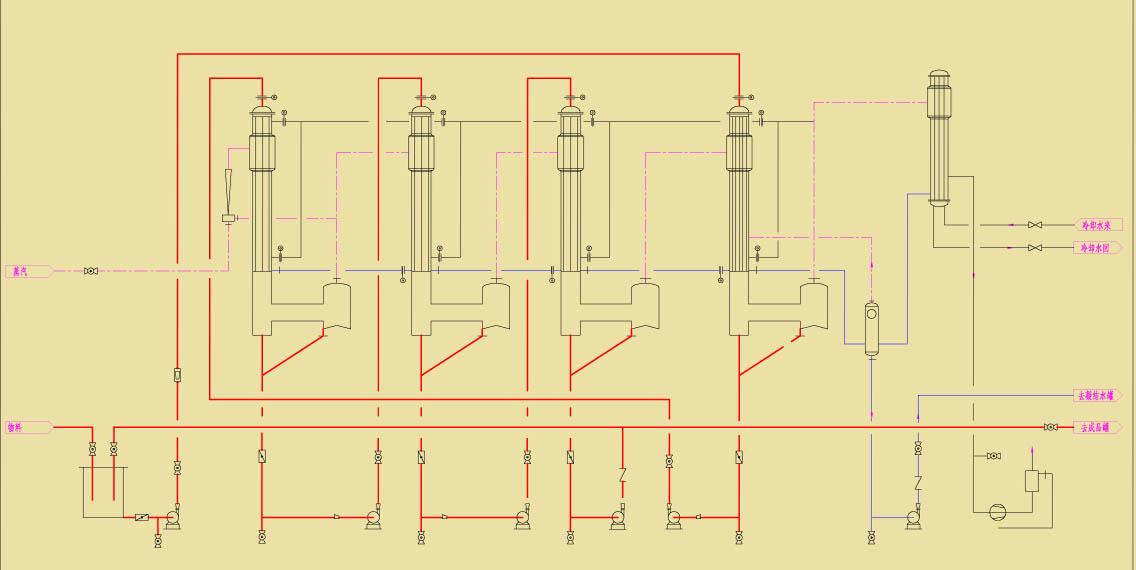 在降膜式蒸發(fā)器中,液體和蒸發(fā)汽向下并流流動(dòng);物料在沸點(diǎn)溫度下進(jìn)入蒸發(fā)器,通過(guò)蒸發(fā)器頂部的液體分布裝置,均勻地沿加熱管壁成膜狀向下流,在向下流的過(guò)程中不斷的蒸發(fā),不斷地被管外的蒸汽加熱。降膜蒸發(fā)器具有傳熱系數(shù)大,物料在加熱過(guò)程中由于停留時(shí)間短而變性小等特點(diǎn)。降膜蒸發(fā)器廣泛應(yīng)用化學(xué)、制藥、天然有機(jī)產(chǎn)品和食品工業(yè)等。降膜式蒸發(fā)器還具有開車快捷、容易切換至清洗操作模式或濃縮另一種產(chǎn)品、適應(yīng)能力強(qiáng)、可控性好、能耗低等強(qiáng)大優(yōu)勢(shì);可以預(yù)見(jiàn)降膜式蒸發(fā)器將在眾多應(yīng)用領(lǐng)域替代其它類型的蒸發(fā)裝置并將不斷完善。